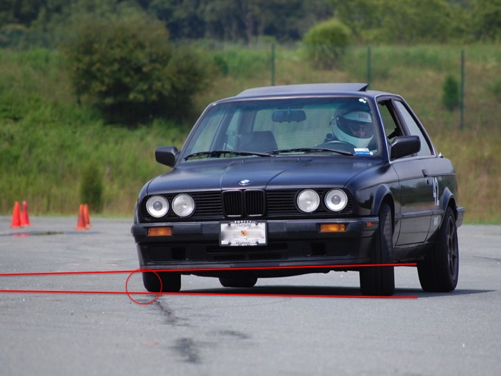 Want to know how much body-roll you have?  Someone is always taking pictures at autocross or track events, so find a good high-resolution image of your car head-on and measure the angle? A good amount is probably in the two to four degree range.  More and you get too much weight transfer to be efficient, too little and you’re losing grip.  If the angle looks good, what is the loaded tire doing? Do you have enough negative camber?  How about air pressure?  This photos shows body-roll of about three degrees, but the loaded front tire is deforming suggesting more negative camber is needed.