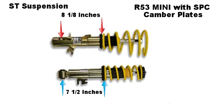 How low can you go? Assuming you are not limited by the angle of your driveway or height of any speedbumps, you can test your new coilover limits by disconnecting any sway bars and installing the strut with bumpstop and no spring. Your coilover manufacturer should tell you the dimensions of your springs when at maximum compression. Install your road wheel and use a floor jack to raise the wheel carrier until the strut is fully compressed (against the bumpstop) or the tire begins to bind with the well liner. Using the dimension of your spring at maximum compression, measure down that distance from the spring cap to the barrel of the strut. Mark that spot and put a second mark 1/2 inch above it (closer to the spring cap). This second mark is the lower limit of where you can safely position the threaded spring-seat lock-ring on the strut barrel. The half inch change to the measured height was there to correct for camber correction later in your alignment. (Remember, this is the limit of how low you could go, not how low you should go. We generally do not recommend lowering MINIs beyond 4 inches as measured at the jack point.) For this MINI application, we’re already pretty close to the limit in the rear, but the front could go quite a bit lower. It just wouldn’t be very practical.
