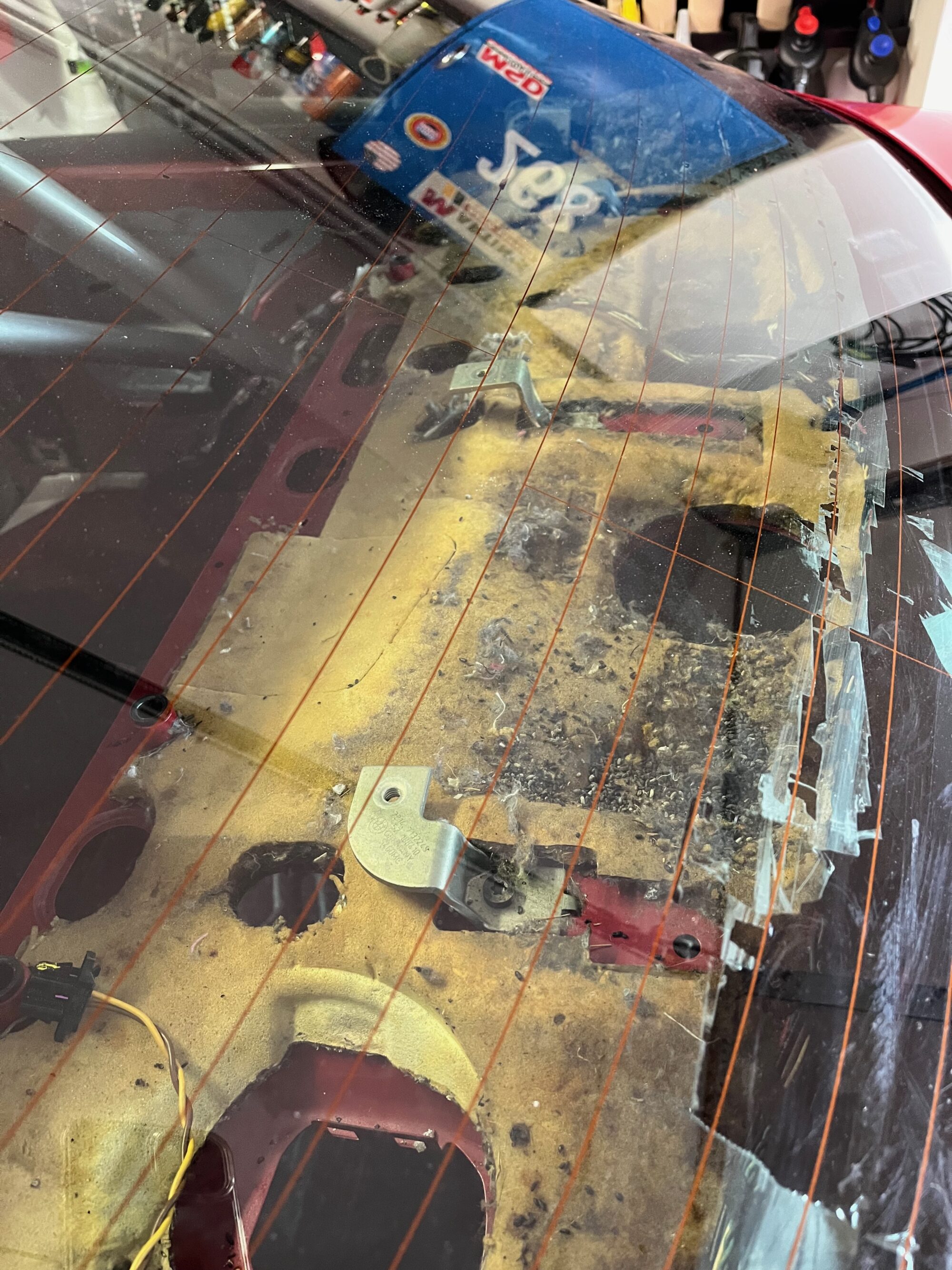 If you’ve ever attempted to remove petrified window film from an E46 coupe, you’ll know how hard it is to get the bottom 3 inches of glass with your scraper. You can try steam, heat, the trash bag method, or GooGone but chances are there will be this small bit you just can’t get without removing the hard plastic trim at the very back of the parcel shelf.  This post is about how you get to it.
