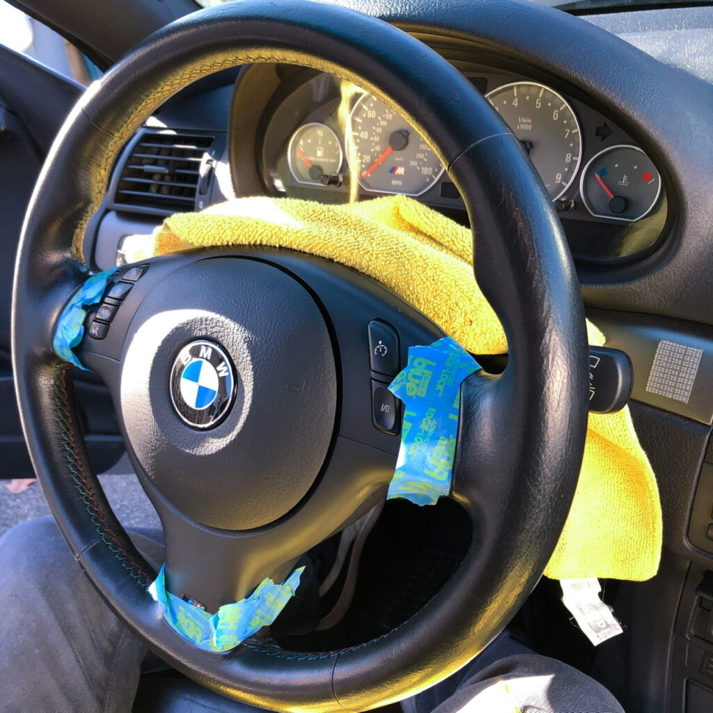 Start by masking off the trim. (If you’re black trim is also in bad shape, consider recovering it with 3M film.) You won’t make a huge mess, but you do want to cover the instrument cluster and your lap. Wear gloves. The chemicals are not harsh, but they will dry out hour skin.