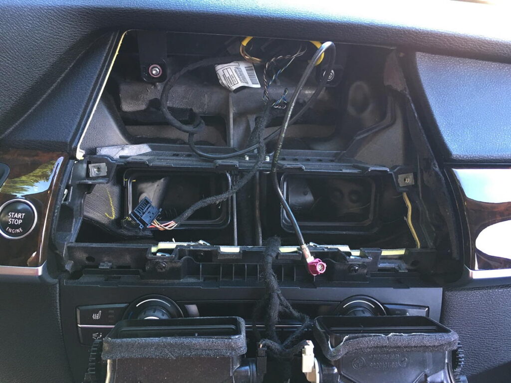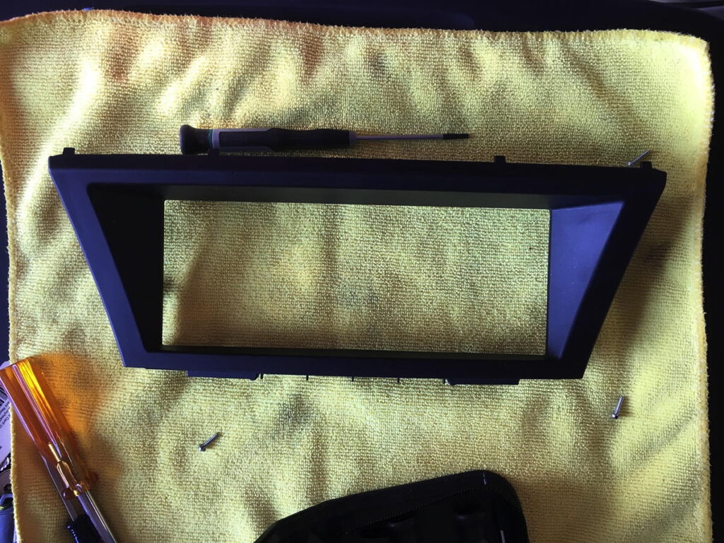 Remove the two screws holding the video frame to the dash.  Be careful not to drop the screws or you’ll spend the rest of your day fishing for them in the HVAC ducts.
