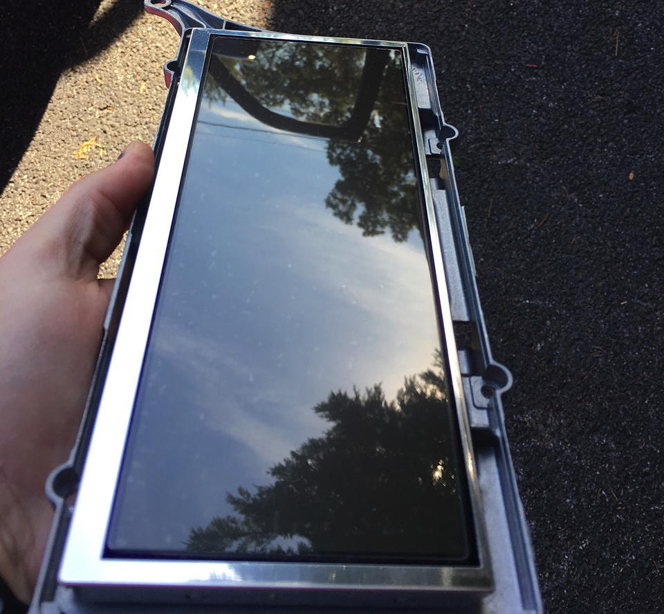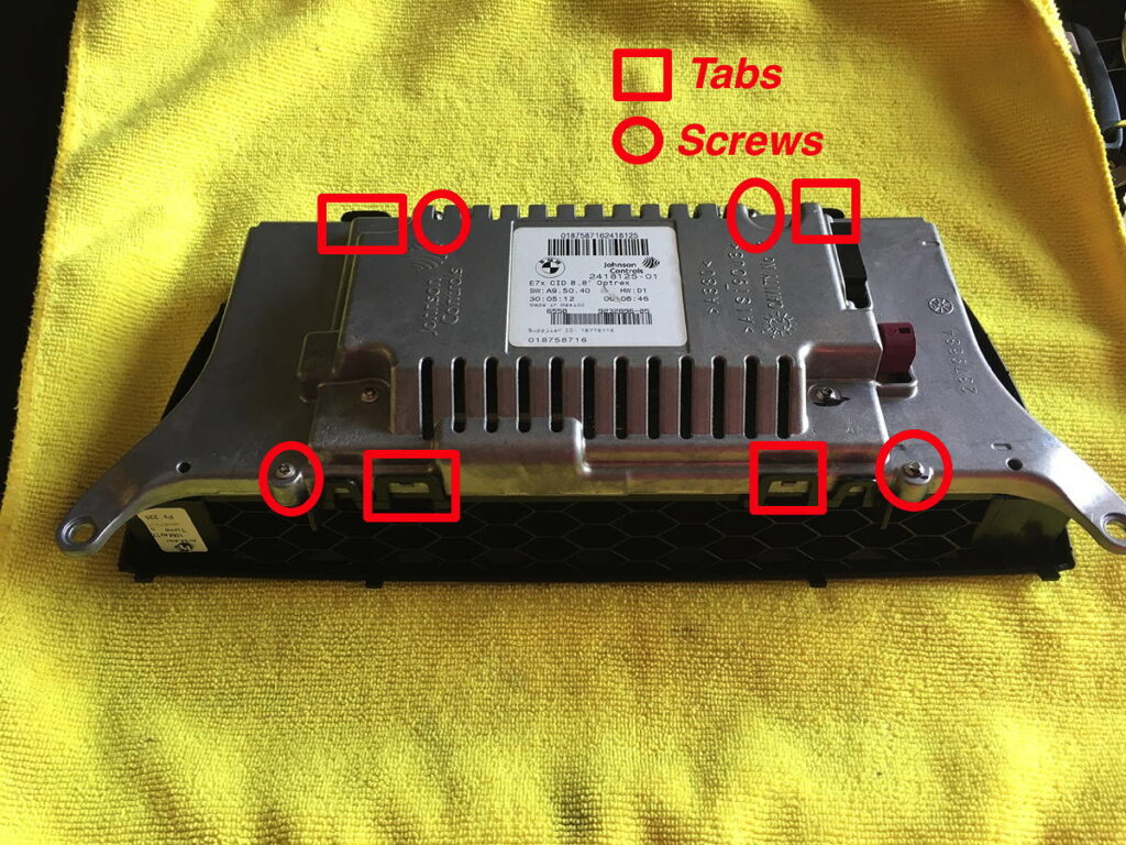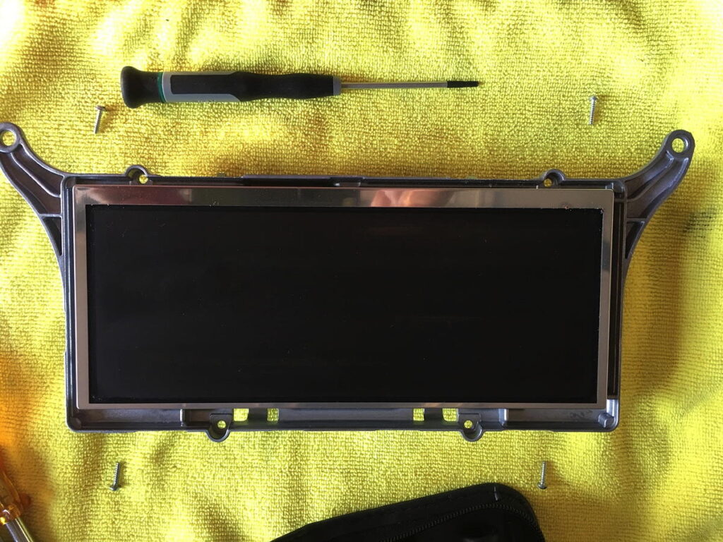 Set the screen face-down on a clean towel. Remove the four Torx screws and carefully remove the video screen from the trim panel by releasing the four tabs. Clean the trim panel while it is out, but be careful not to scratch the coating on the plastic.