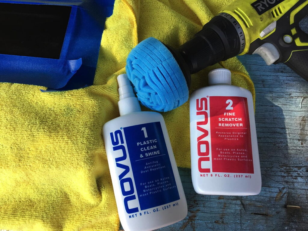 You’ll need a plastic pry tool, a crosshead screw driver, some painters tape, a Torx T-9 socket, and some plastic  polish.  We used The Novus Plastic Polish kit with a clean power-ball polisher we had from a headlight polishing kit, and an electric drill. You can also get a protective screen cover — just like your mobile phone.  More on that later.