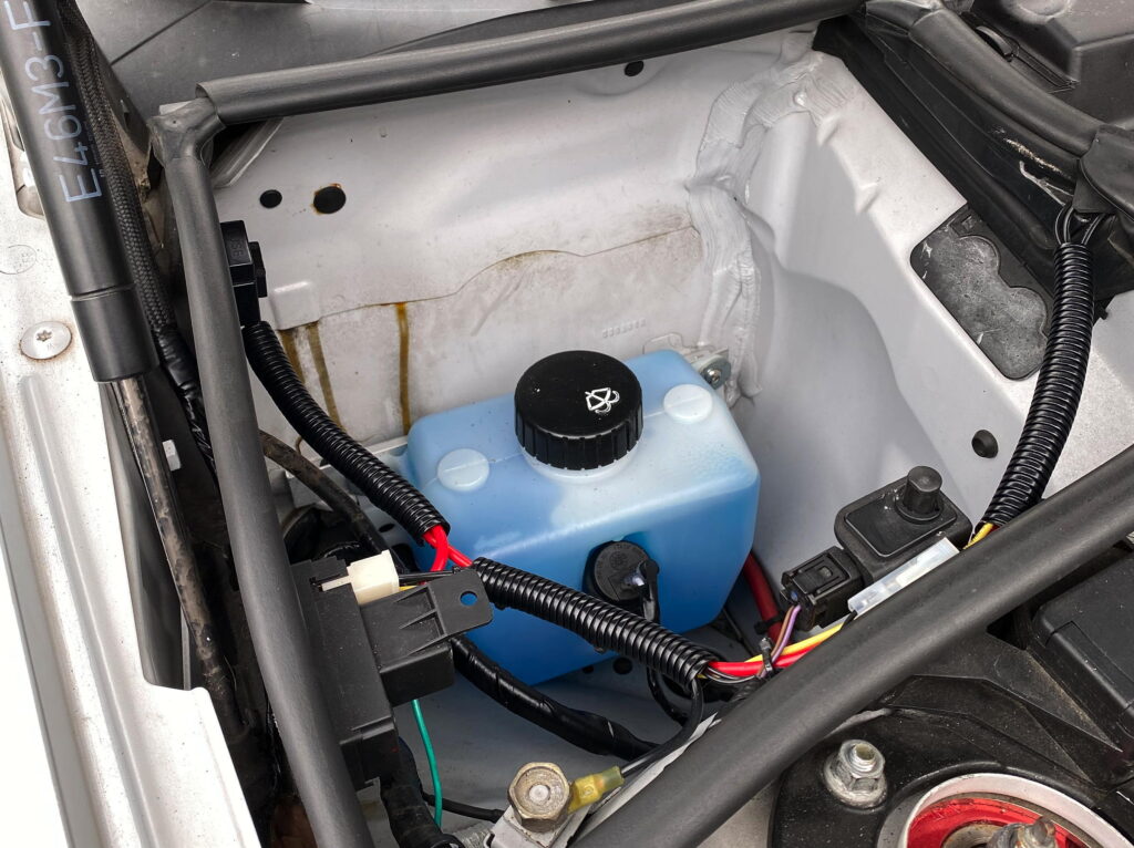 If you installed brake ducts in your E46 M3 track car, chances are you also removed the windshield washer reservoir (aka, “windshield cleaning container” part number 61 67 7 895 571). The container wraps around the AC dryer and sits in the path of the Hardmotorsport bumper duct inlet. If you no longer drive your car on the street, this probably makes sense. After all, a track build is all about adding lightness and removing complexity. If you still drive it on the street, it can also be about bugs. Lots of bugs. Bugs smeared on your windshield. Since I still drive this car on the street, I decided I wanted to find a way to retrofit a smaller container in the smuggler’s hold.