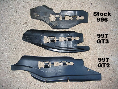 The key to this mod is not to use the 996 GT3 spoilers which are about $90 each, but instead use the spoilers from a 997 GT3, which (unusually for Porsche) happen to be priced about $10 each.