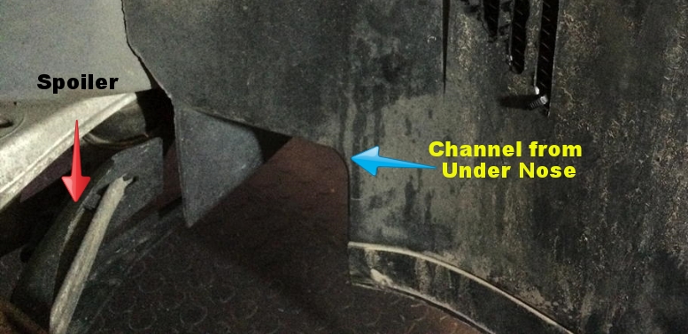 At high speed, the front end of the 996 seems a bit light. For cooling purposes, it’s a fairly efficient design: High pressure air enters the openings in the front of the bumper, passes through the AC condensors and radiators, before exiting toward the pavement ahead of the wheels. The design tends to cause the front to lift at high speed, as well as catch leaves, bugs, and debris between the condenser and radiator. We can’t do much about the leaf problem for now, (except remember to clean the radiators each year,) but we can do something about lift and improve brake cooling at the same time.