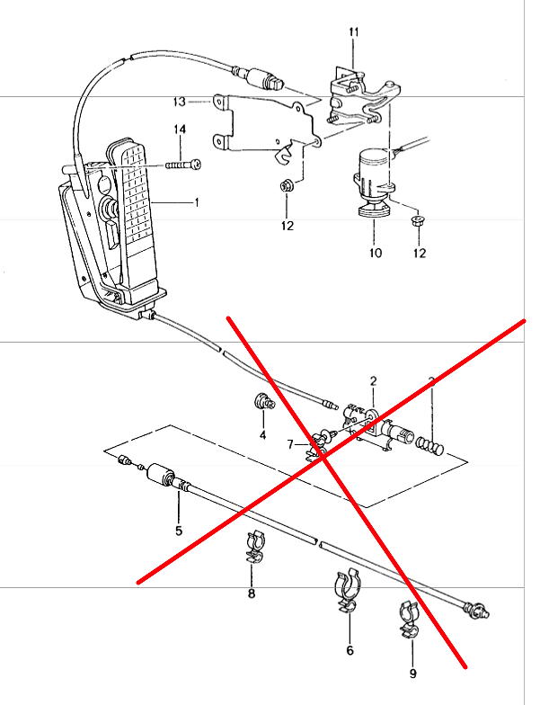First lets start with the pedal assembly. Porsche switched to e-gas (electronic throttle) in 2000. The pedal assembly has a hinge at the base and a metal rod under the pedal that activates a lever. The lever pulls a cable which used to be connected to the throttle body. Beginning in 2000, the cable connects to a sensor (#10) that communicates with the throttle body through the data bus. This is fortunate for a couple of reasons, not the least of which is that it means that throttle response is tunable.