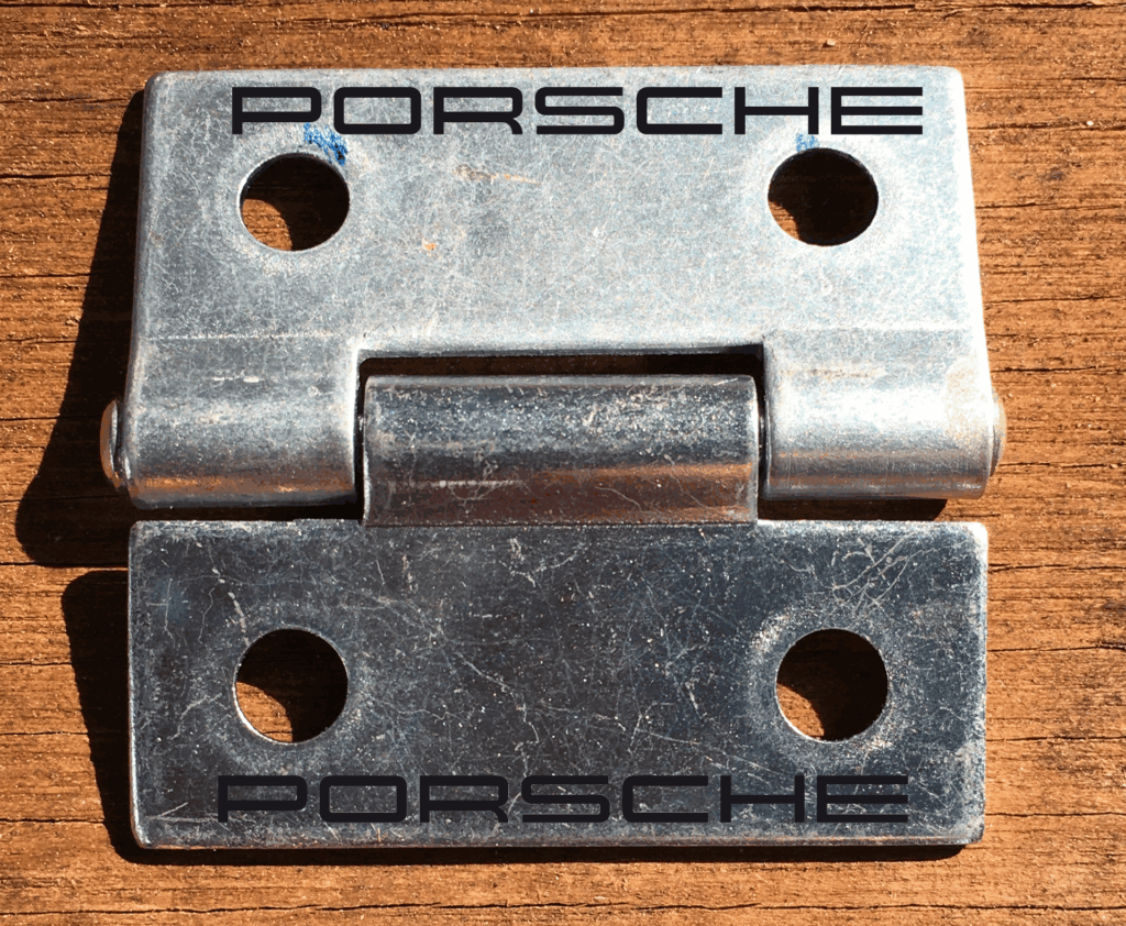 Using the Rennline option as inspiration, we headed off to the local hardware store. Found a hinge of about the right size, scrounged some pop-rivets, and a few minutes later, had a viable hinge again. It doesn’t look bad and seems to do the job. I suppose we could find a way to screen “Porsche” on it and sell them for $50 each….