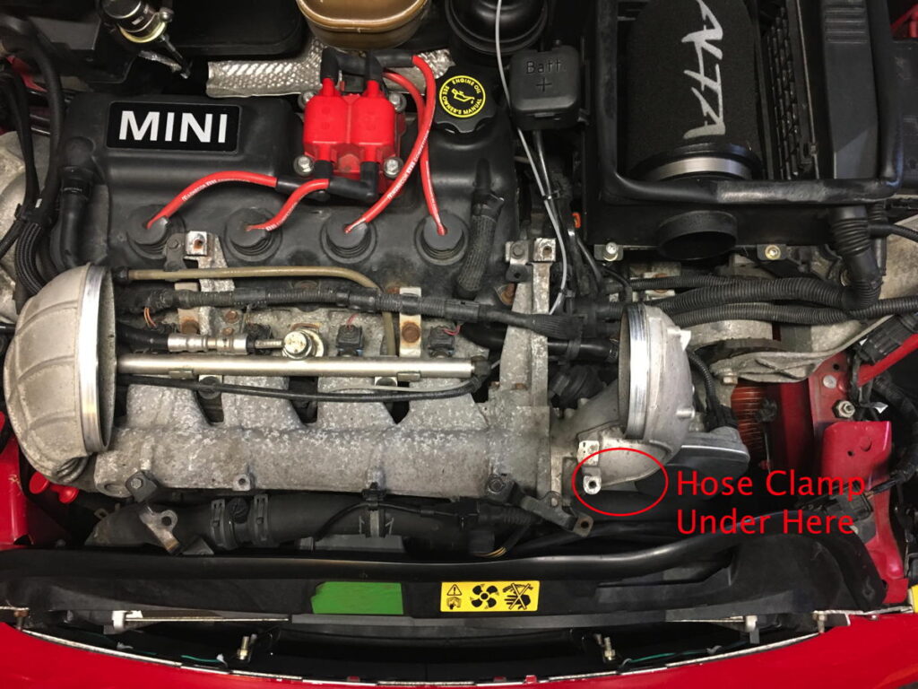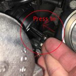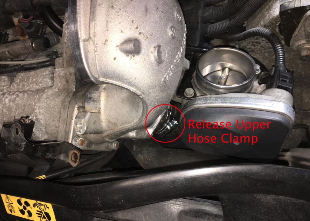 - Use a long flat blade screw driver and release the upper clip of the hose clamp from the old BPV. Discard the stock clamp and replace with the one included in kit. (Photo below shows new clamp installed because it’s easier to see than the stock clamp.)