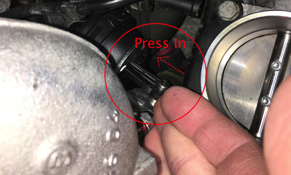 - Hold the horn with one hand and gently push down on the supercharger intake tube where you removed the throttle body to separate it from the horn. Only gentle pressure is needed.