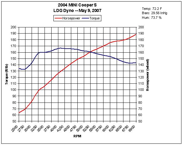 Much to my surprise (and I think John’s as well) it was pulling 188.8 hp at 6900 RPM. Max torque was 165.9 ft-lb at 4250 RPM. Considering those numbers were at the wheels, that’s about 207 hp and 188 ft-lb of torque at the crank. Chart below. Not bad when you consider the cost of those mods adds up to only about $1,500.