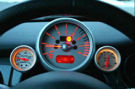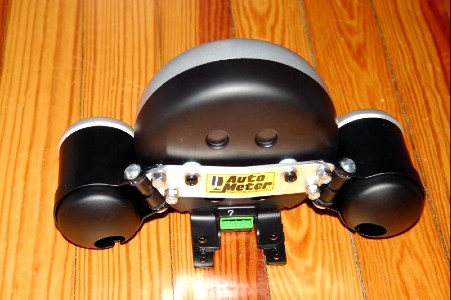 I found was the Autometer Ultra-light series of gauges. They fit in nicely with the MINI gauge design. Autometer sells black mounting cups which are possible to attach directly to the back of the tachometer (with slight modification for the 2 1/16 inch size cup mounts) but I wanted something more secure. So I built my own mounting bracket.