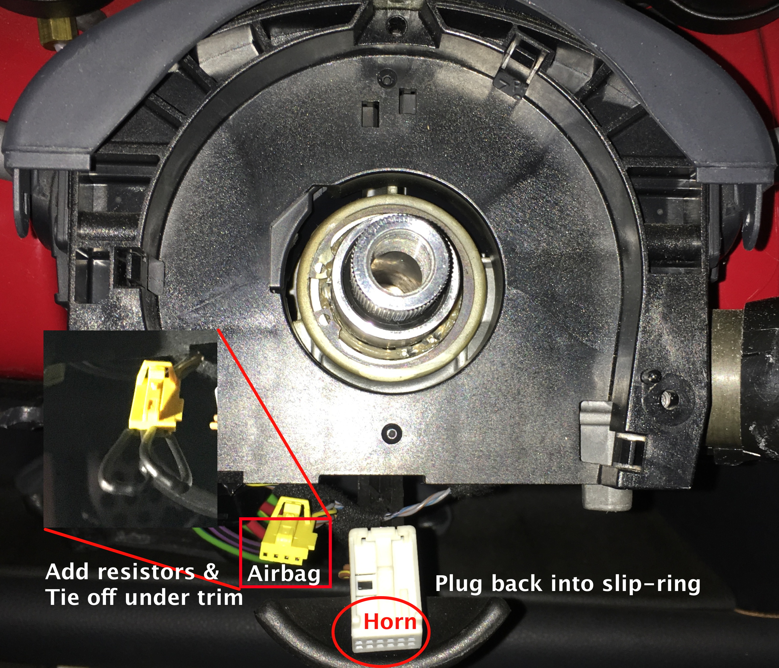 Before you install the hub, place two resistors into the airbag connector formerly plugged into the slip-ring and zip-tie it back out of the way.