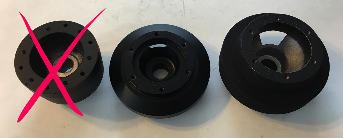 We bought three hubs which are widely available and advertised to fit the MINI steering spindle. The photo shows them left to right from Sparco, NRG, and MOMO. It turns out the Sparco one we got which is listed as fitting ‘MINI after 2001’ is actually for the classic Mini BEFORE 2001 (part number 015002038), not BMW MINI which is Sparco part number 01502183CA. So that left the MOMO and NRG hubs as contenders.