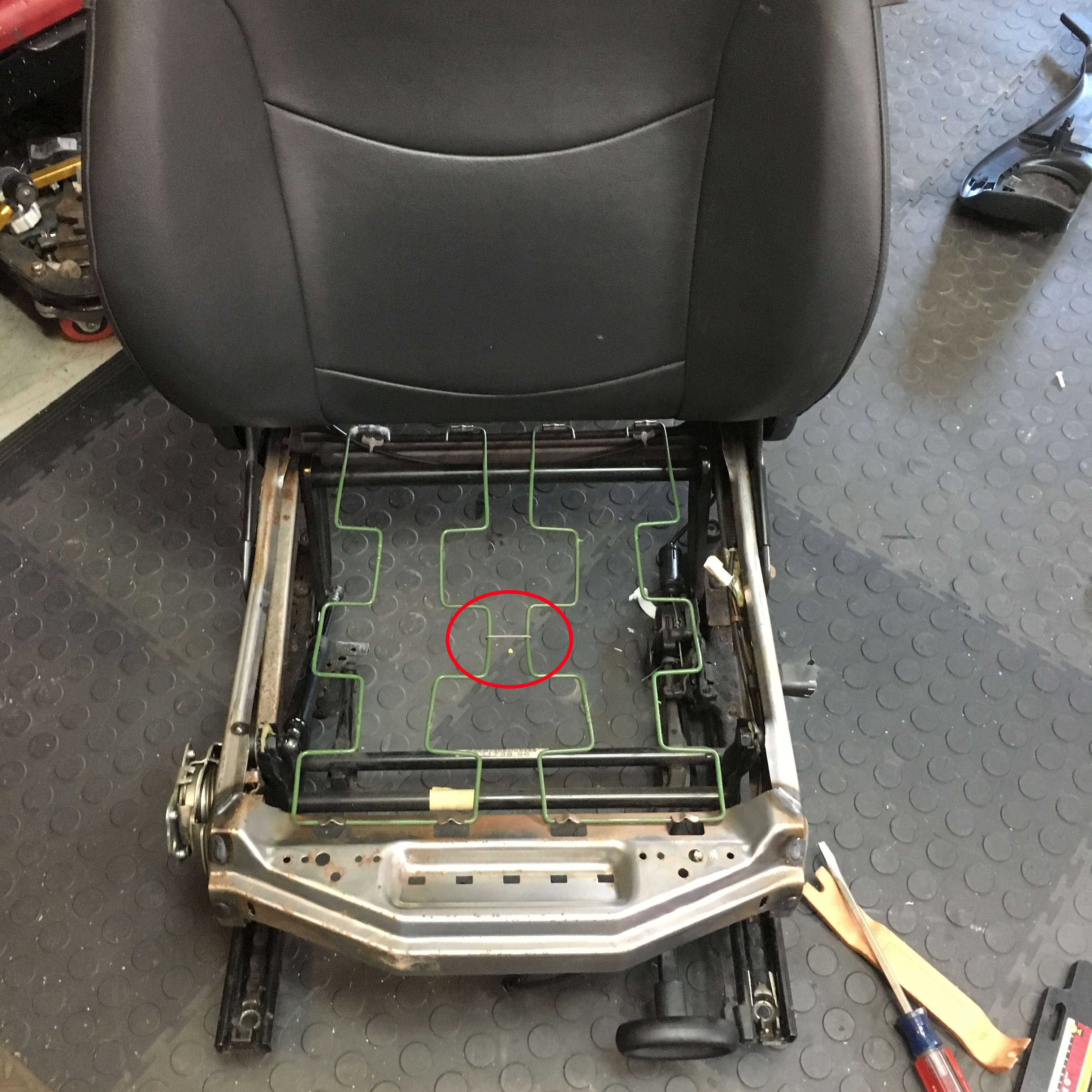 A broken seat-back adjustment spring requires a new frame so you’re better off just replacing the seat. The tilt-slide mechanism is built into the seat rail and not available as a separate part. Both of those failures are annoying, but do not affect the safety of the seat. The height adjustment is also just annoying, but it’s an easy repair. Seat cushion springs are an easy repair; seat back springs are a little harder. Seat heaters are also not available as individual parts. They require purchase of the entire cushion and cover. In 2002-2004 cars the heaters were glued to the cover. In 2005-2006 cars it is a separate mat and can be salvaged from another seat. The good news is that the connectors are the same.