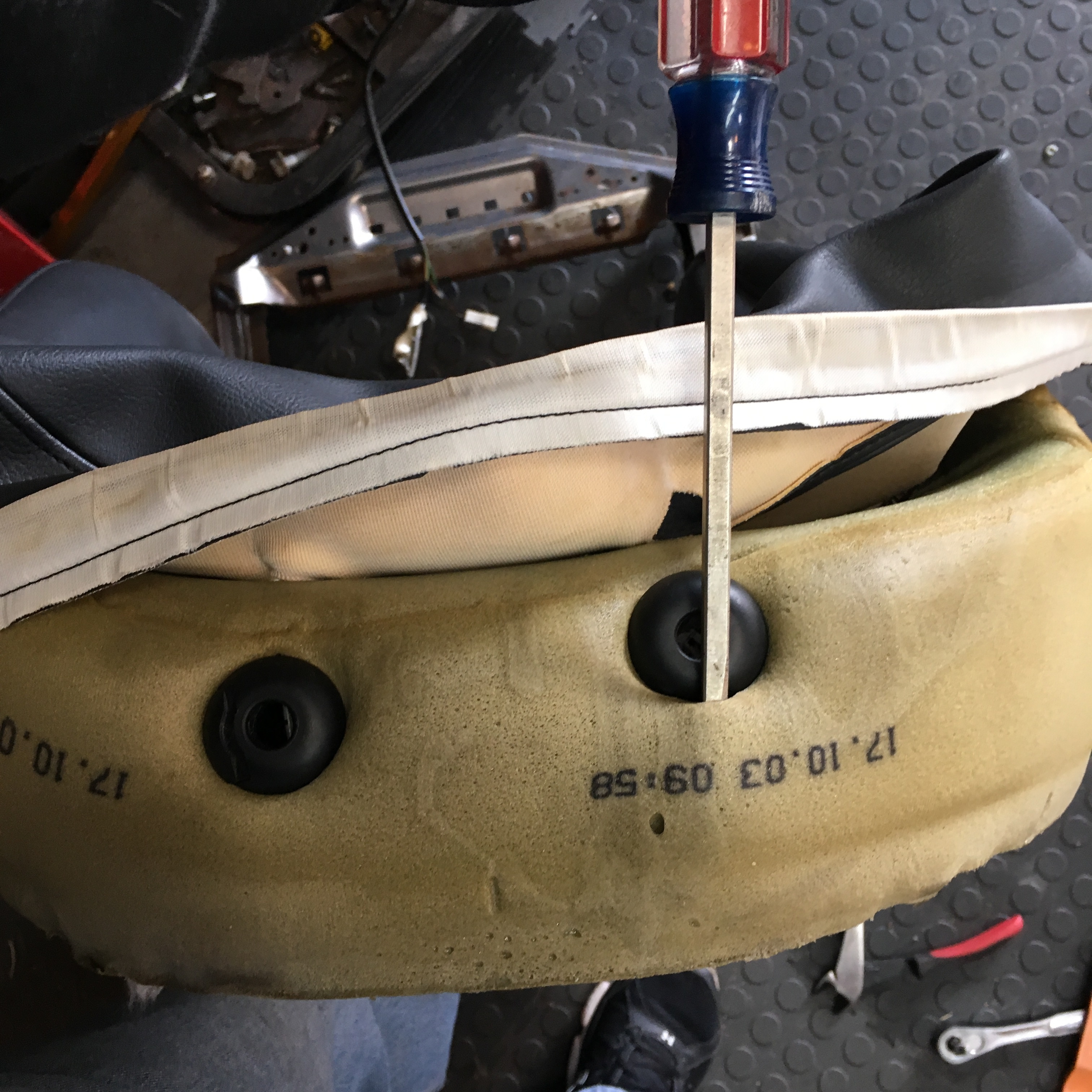 The seat we’re deconstructing already had the set belt buckle removed since it was moved to the replacement seat. If you are just repairing the cushions or springs, you do not need to remove it.
