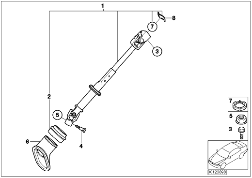 If you experience “heavy” steering; notched steering; and/or crunchy steering, try checking these three items below. The first two are caused by faulty designs. The third was probably caused by someone (not me) forgetting to disconnect the lower steering knuckle before lowering the rear portion of the front sub-frame. The steering column is designed to move in many directions: That motion isn’t one of them. It’s a $125-$150 part if you can find it (part number 32306763722 #1 in the drawing below).