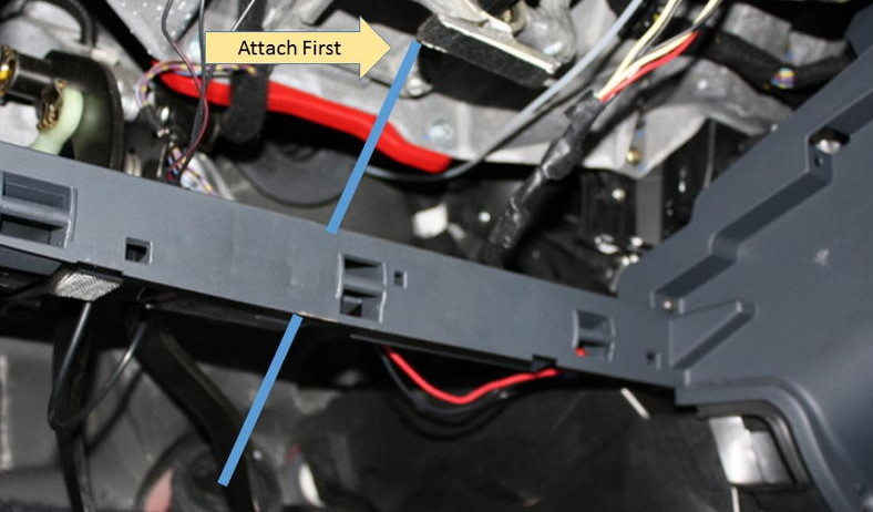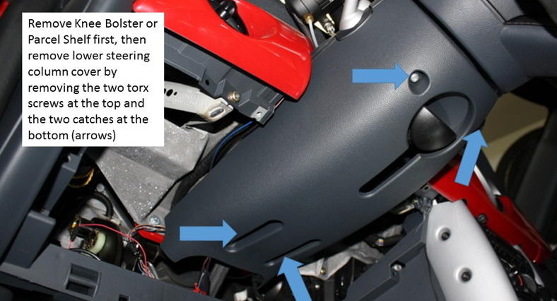 9. Locate and remove the two hex screws at the top of the lower column cover and release the two clips at the bottom by pinching them together