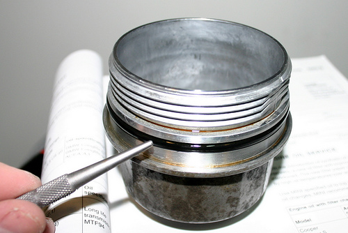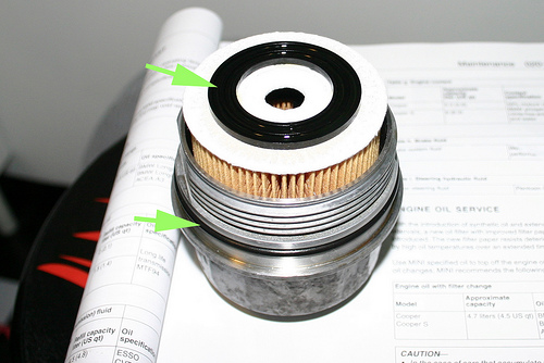 Clean up the housing and remove the old O ring. Use a pocket knife or even a ball-point pen to remove the old O ring, taking care not to damage the housing. Put some fresh oil in the groove and replace the O ring with the new one that came with your filter. Put some more oil on the new O ring so it doesn’t twist when you put it back on the block. Press the new filter all of the way into the new housing. Spread some new oil on the gasket on the end of the filter. This will help make it easier to remove next time.