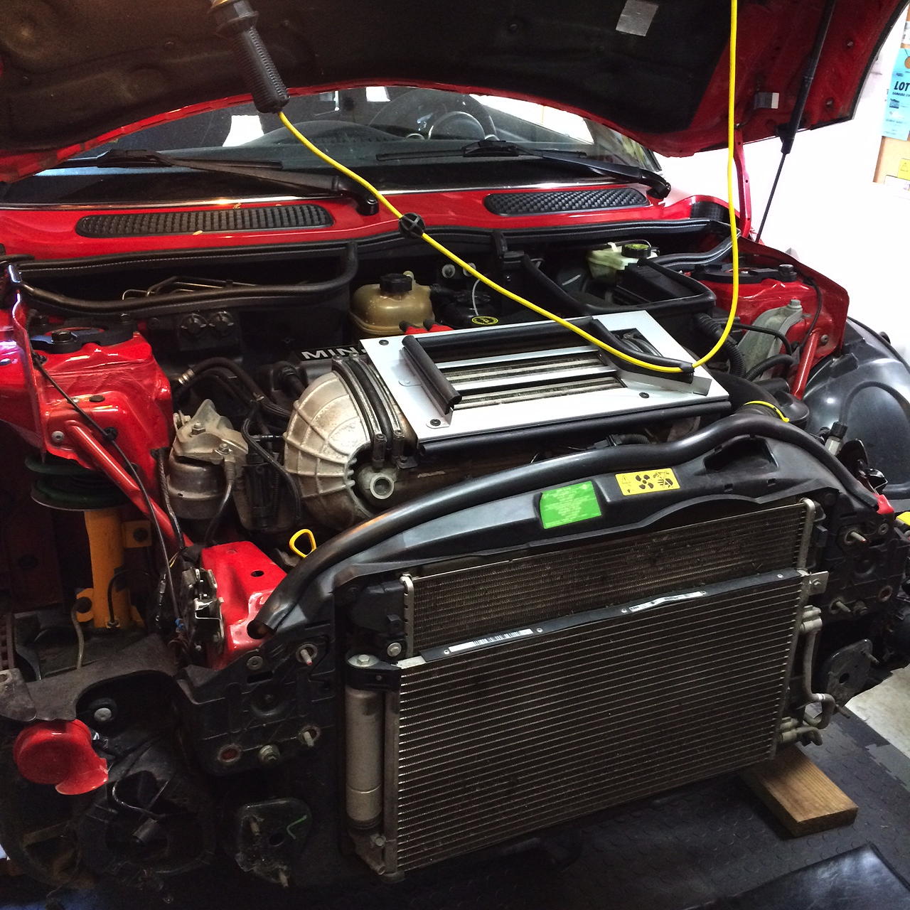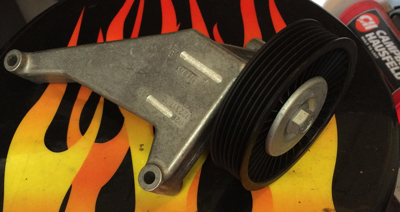 The clutch on the AC compressor died the other weekend at the track and since the AC was anemic at best, we decided just to delete it, saving almost 25 lbs of weight, mostly ahead of the front axle.  Fortunately, MINI makes a deflection pulley (11287570810) for just such a purpose — so you can keep the same belt routing.  You’ll also want to pick up two M8 x 50 Hex Bolts (07119904533), re-use the collar screw and spacer from the compressor, and pick up a nut and washer to work with the collar screw. This isn’t the most complicated DIY we’ve attempted, but if you remove all of the piping, it can be a difficult job and should be performed by someone with experience.  Do not attempt to remove any component of the AC system without first having the system discharged in a safe manner.  The information below is intended to supplement the use of an appropriate shop manual and are not intended to cover every aspect of the job.  Proceed at your own risk.  No wagering.