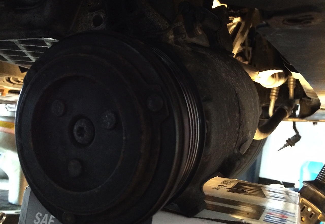 9. Supporting the compressor, remove the top bolt and rest the compressor on a box.