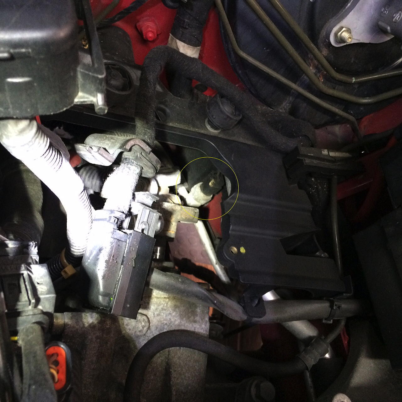 14. Notice the sensor located in one of the lines. Disconnect the electrical connection to this sensor.  Once the line is removed, we’re going to remove the sensor, seal it up, reattach the electrical connection, and tie it off under the air intake.  (If we don’t do this, the fan will run all of the time.)