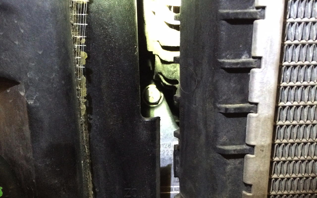 6. There is some foam insulation to the left side of the radiator.  Move it aside to access the top right bolt holding the compressor.  Remove the bolt with a 13mm socket.