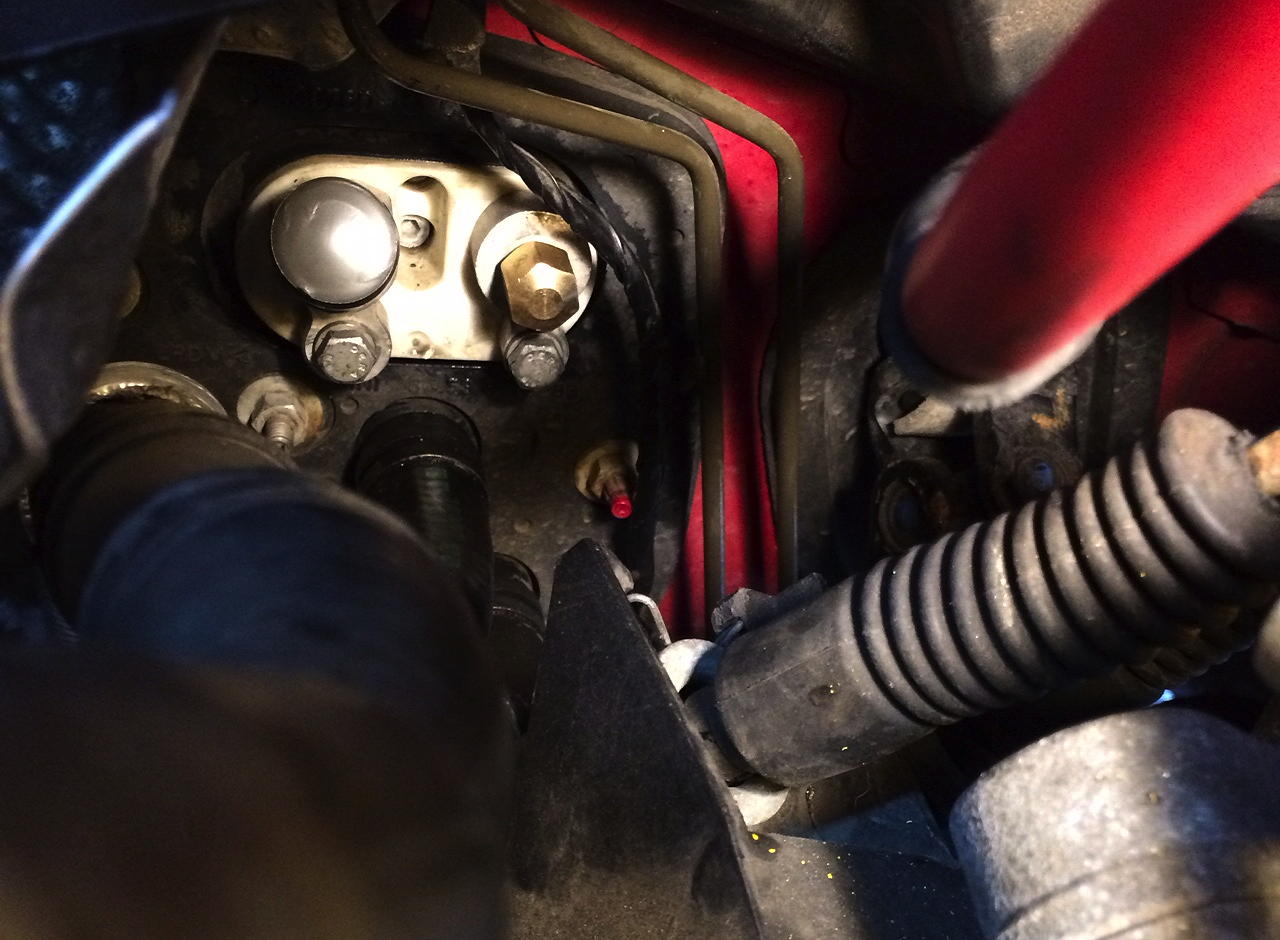 16. The larger of the two lines is not so easy to remove.  I suppose if you removed the motor mount you may be able to lift it out, but since ours was shot anyway, we just decided to cut it in two places.  Remove the sensor and reinstall it as mentioned in step 12.  Cap off the opening at the firewall as well.