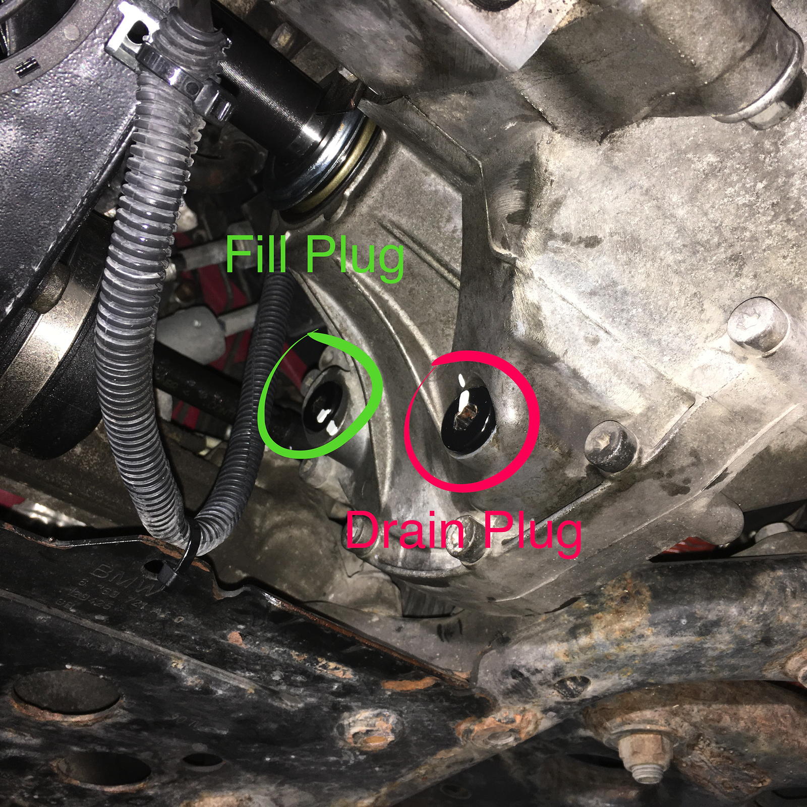 Safely place your car on jack-stands with the car level, and make sure you get it high enough to get your bottle of new fluid with pump attached underneath it with enough room to actually pump the fluid. On the R53, the there are two 8mm hex plugs on the side of the transmission across from the PS fan. The lower plus is the drain and the top one is the fill.