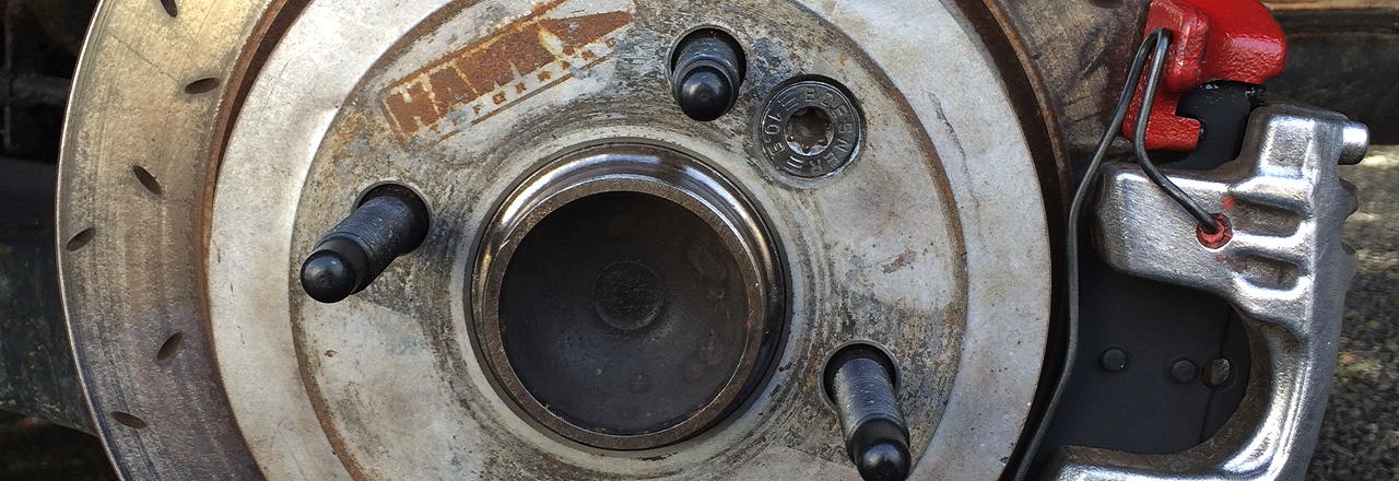 Because my car is outside most of the time, I like to replace the wheel studs every other year. This has been an especially harsh winter so they are really very corroded. The process is not difficult, but getting good leverage in a tiny garage without a lift can be a challenge. Here’s the method that works for me.