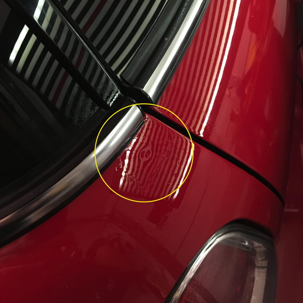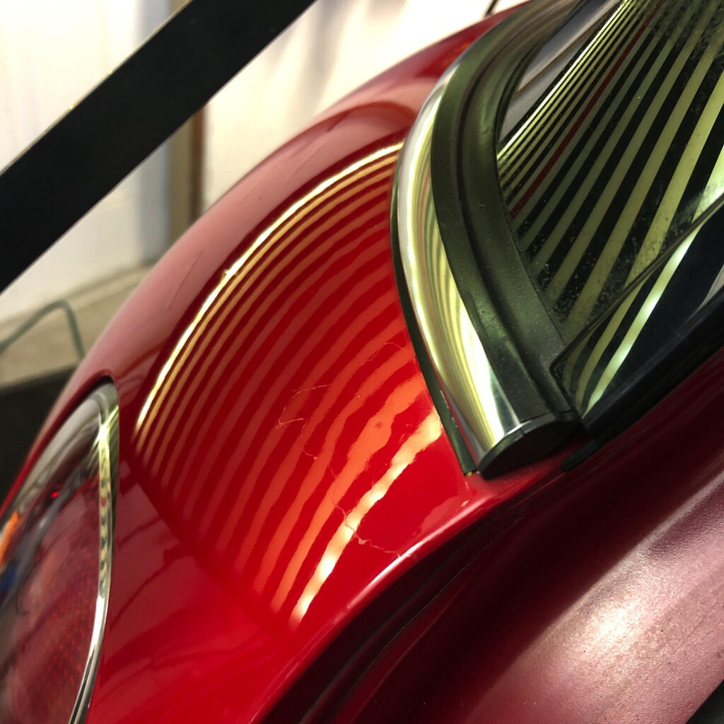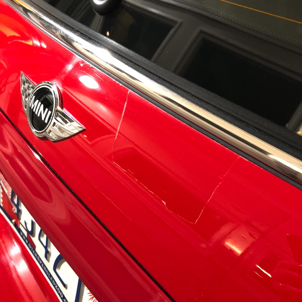 The dent wasn’t huge, but I noticed it each time I opened the hatch. The hook didn’t crack the paint, but it did crack the clear-coat, which will become an issue shortly.