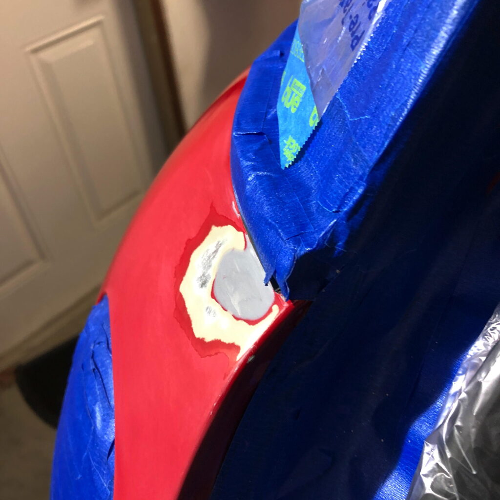 I made pretty good progress pushing from the inside and hammering from the outside. I probably would have kept up with this approach if the clear-coat wasn’t missing. Another hour and it would be almost undetectable, but since I was going to have to use some filler to try to level the clear, I just switched over to the Scratch Wizard body filler.