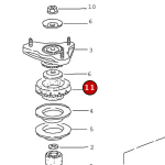 The part that needed to be replaced is shown as #11 in this diagram.  It sits between the strut mount on the top and the spring below.  Between the bearing and the spring is a plate (#4) and the rubber spacer (#5). The interesting thing about this design is that you can fine-tune the ride height by using a thicker or thinner (in my case) rubber spacer. The way the design works, the piston of the strut is held in place by the retaining nut, and the strut body and spring rotate underneath it. When I took it apart, the plate (#4) was missing and the bearing was falling apart — hence the groaning whenever it spun.