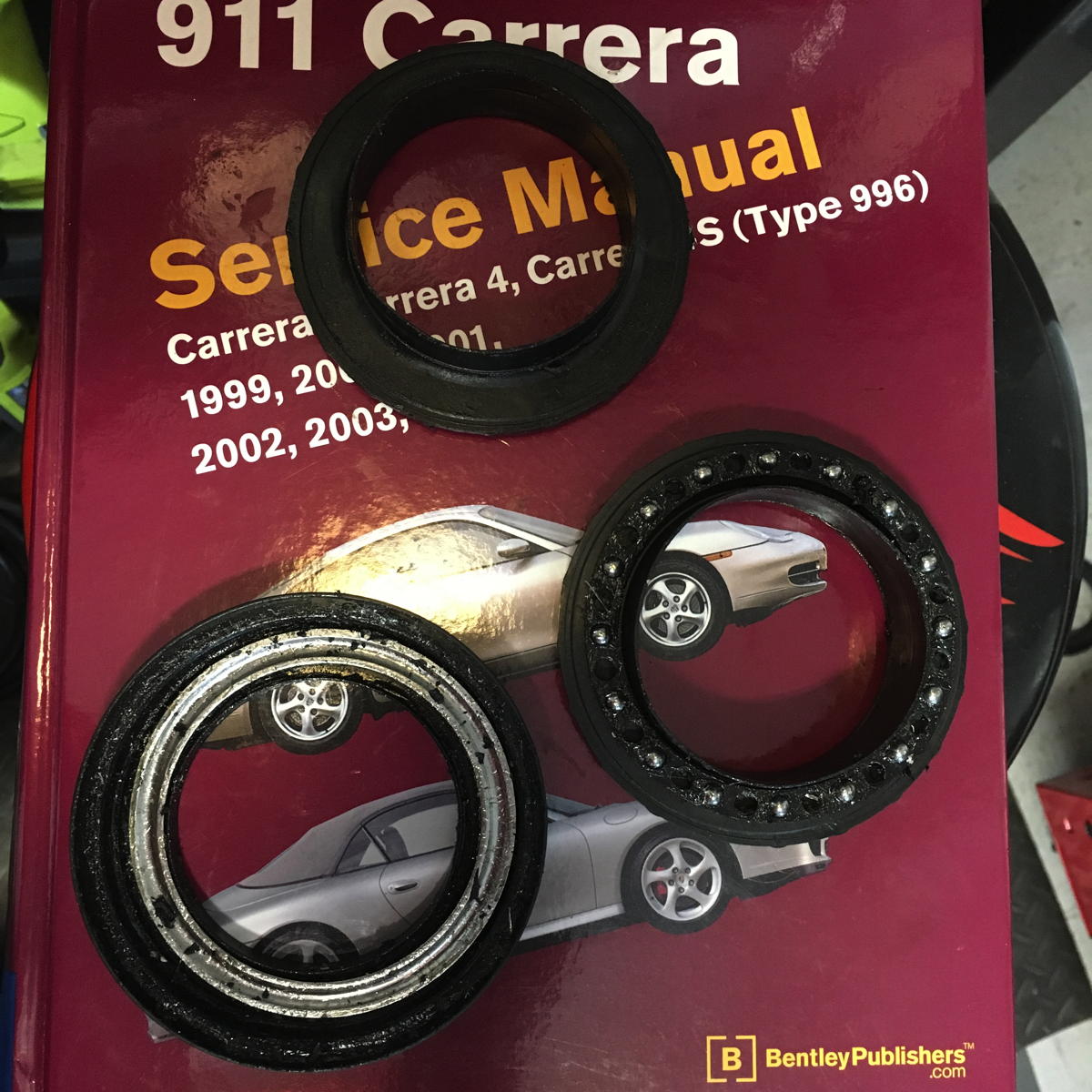Here’s a helpful hint to see if something might be wrong.  When you take the strut apart and the bearing comes out as three pieces. Something’s wrong. It’s supposed to be one sealed unit. The good news is that it isn’t terribly expensive (part number 996-343-515) and is usually $35-$45 each.  There must be a Porsche Motorsports part that’s more robust….