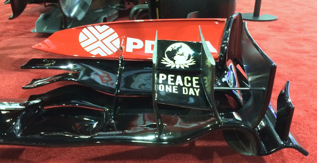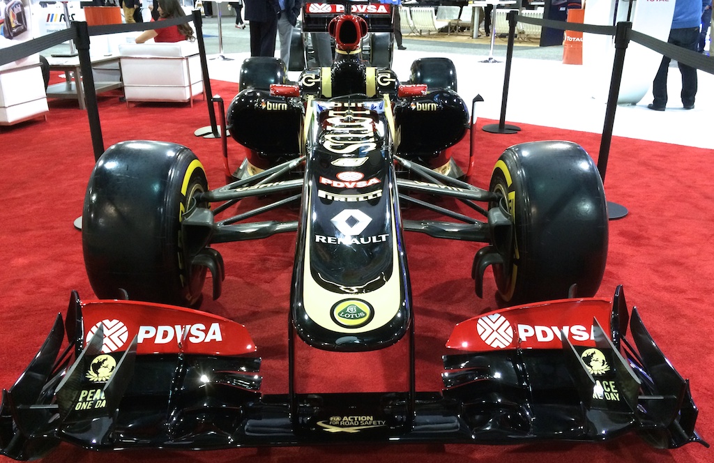The Total Company had a Renault F1 car at their booth during the SEMA show in Las Vegas. There wasn’t even a plaque saying what it was. I guess since SEMA isn’t really about F1 they figured nobody really cared. After all, you’d be hard pressed to find double-dubs that would fit.