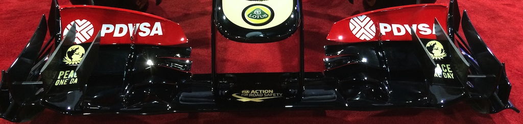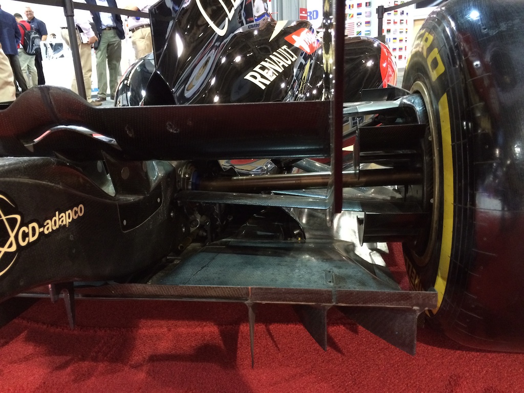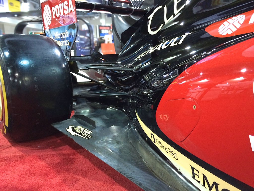 As best I can tell by searching the Google, this is the R31 from the 2011 season. It isn’t the most recent car, but it was completely unguarded so I took the opportunity to get some detailed photos. Though the names on the car are of the current drivers, this was the car driven by Nick Heidfeld and Vitaly Petrov to two surprising 3rd place finishes at the beginning of the 2011 season. The car went on to place Lotus Renault 5th in the constructor’s championship, which given the size of their budget that year, was a good accomplishment.